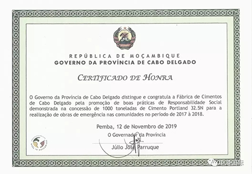 2019年11月28日,德爾加督省省長親自簽發,工商局局長親自向水泥廠頒發了莫桑比克政府對德爾加督水泥廠長期以來支持社會公益和公共事業發展的榮譽證書,以表示對水泥廠的感謝。
